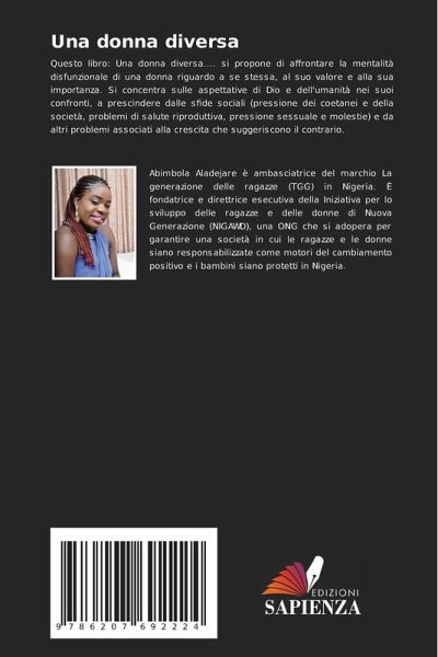 Questo libro: Una donna diversa.... si propone di affrontare la mentalità disfunzionale di una donna riguardo a se stessa, al suo valore e alla sua importanza. Si concentra sulle aspettative di Dio e dell'umanità nei suoi confronti, a prescindere dalle sfide sociali (pressione dei coetanei e della società, problemi di salute riproduttiva, pressione sessuale e molestie) e da altri problemi associati alla crescita che suggeriscono il contrario.