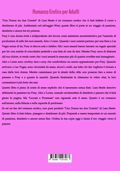 "Una Donna tra due Uomini" di Lara Steele è un romanzo erotico che ti farà battere il cuore e desiderare di più. Ambientato nel selvaggio West, questo libro ti porta in un viaggio di passione, desiderio e amore tra tre persone.Posy è una donna forte e indipendente che lavora come assistente amministrativa per l'azienda di produzione di selle dei suoi amanti, Alex e Loren. Quando i suoi uomini partono per una fiera a Las Vegas senza di lei, Posy si ritrova sola e infelice. Ma i suoi amanti hanno lasciato un regalo speciale per lei: una scatola di cioccolatini preferiti e una lista di cose da fare. Mentre Posy cerca di distrarsi dal suo dolore, si rende conto che i suoi amanti le mancano più di quanto avrebbe mai immaginato.Alex e Loren sono cowboy duri e sexy che condividono un amore appassionato per Posy. Quando arrivano a Las Vegas, sono circondati da sesso, alcool e soldi, ma tutto ciò che vogliono è tornare a casa dalla loro donna. Mentre camminano per le strade della città, non possono fare a meno di pensare a Posy e a quanto le manchi. Quando finalmente la chiamano in video chat, la loro connessione è più forte che mai.Questo libro è pieno di scene di sesso esplicito che ti lasceranno senza fiato. Lara Steele descrive abilmente la passione tra Posy, Alex e Loren, creando un'atmosfera di desiderio e piacere che ti farà girare le pagine. Ma "Leccate e Promesse" non riguarda solo il sesso. Questo è un romanzo sull'amore, sulla fiducia e sulla capacità di perdonare.Se sei un fan del romance erotico, non puoi perderti "Una Donna tra due Uomini" di Lara Steele. Questo libro ti farà ridere, piangere e desiderare di più. Preparati a essere trasportato in un mondo di passione, desiderio e amore senza fine. Ordina la tua copia oggi e inizia il tuo viaggio verso il piacere.