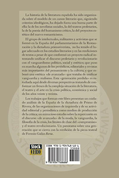 The Spanish literature canon has been traditionally organized following a criteria circumscribed by ideology, thus leaving out many valuable strains of literary creation: social novels, proletarian plays, critical humanist poetry, the aesthetics projects of the new romanticism. The group of politically active intellectuals that flourished in Spain during the Parliamentarism, Restoration and the Primo de Rivera dictatorship periods has not been properly included in literary studies, despite it fostered a radical movement that attempted to unify proletarian and political avant-garde revolutionary social and aesthetic discourses, set in motion several of the more culturally influential newspapers, magazines and book publishers, and outlined advanced aesthetics unifying avant-garde and realism. This veritable lost generation is studied in this book from different perspectives, in an attempt to sketch the complex situation of literature, theater and art within the political, economic and social environment of the Spanish twenties and thirties. The works included in this book carefully analyze the Spain of Primo de Rivera dictatorship, the leftist organizations and their book and newspaper production as a means of criticism, as well as a detailed study of their impact on fashion's advanced speech, art, the avant-garde, the philosophy of the crisis, the class limits of political commitment and revolutionary theater. An overview of a generation that ends with the reprint of Berta a play by Fermin Galan.