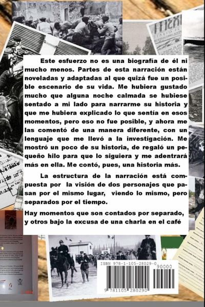 El encuentro del autor con los acontecimientos que vivió su padre durante la Guerra Civil Española. Este esfuerzo no es una biografía de él ni mucho menos. Partes de esta narración están noveladas y adaptadas al que quizá fue un posible escenario de su vida. Me hubiera gustado mucho que alguna noche calmada se hubiese sentado a mi lado para narrarme su historia y que me hubiera explicado lo que sentía en esos momentos, pero eso no fue posible, y ahora me las comentó de una manera diferente, con un lenguaje que me llevó a la investigación. Me mostró un poco de su historia, de regaló un pequeño hilo para que lo siguiera y me adentrará más en ella. Me contó, pues, una historia más. La estructura de la narración está compuesta por la visión de dos personajes que pasan por el mismo lugar, viendo lo mismo, pero separados por el tiempo. Hay momentos que son contados por separado, y otros bajo la excusa de una charla en el café