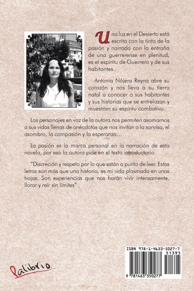 Una luz en el Desierto está escrita con la tinta de la pasión y narrada con la entraña de una guerrerense en plenitud, es el espíritu de Guerrero y de sus habitantes. Antonia Nájera Reyna abre su corazón y nos lleva a su tierra natal a conocer a sus habitantes y sus historias que se entrelazan y muestran su espíritu combativo. Los personajes en voz de la autora nos permiten asomarnos a sus vidas llenas de anécdotas que nos invitan a la sonrisa, el asombro, la compasión y la esperanza... La pasión es la marca personal en la narración de esta novela, por eso la autora pide en el texto introductorio. "Discreción y respeto por lo que están a punto de leer. Estas letras son más que una historia, es mi vida plasmada en unas hojas. Son experiencias que nos harán vivir intensamente, llorar y reír sin límites".