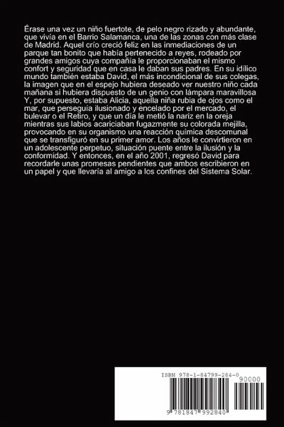 Érase una vez un niño que vivía en el Barrio Salamanca, una de las zonas con más clase de Madrid, junto a un parque tan bonito que había pertenecido a reyes. En su idílico mundo también estaba David, el más incondicional de sus colegas, la imagen que en el espejo hubiera deseado ver nuestro niño cada mañana si hubiera dispuesto de un genio con lámpara maravillosa Y, por supuesto, estaba Alicia, aquella niña rubia de ojos como el mar, que perseguía ilusionado y encelado por el mercado, el bulevar o el Retiro, y que un día le metió la nariz en la oreja mientras sus labios acariciaban fugazmente su colorada mejilla, provocando en su organismo una reacción química descomunal que se transfiguró en su primer amor. Los años le convirtieron en un adolescente perpetuo, situación puente entre la ilusión y la conformidad. Y entonces, en el año 2001, regresó David para recordarle unas promesas pendientes que ambos escribieron en un papel y que llevaría al amigo a los confines del Sistema Solar.