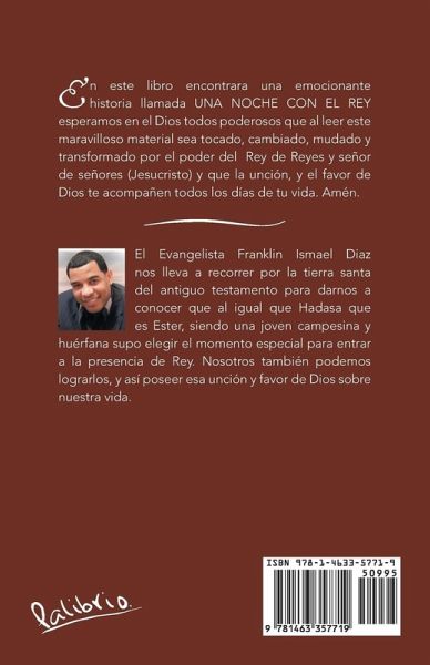 En este libro encontrara una emocionante historia llamada UNA NOCHE CON EL REY esperamos en el Dios todos poderosos que al leer este maravilloso material sea tocado, cambiado mudado y transformado por el poder del Rey de Reyes y señor de señores (Jesucristo) y que la unción y el favor de Dios te acompañen todos los días de tu vida. Amén. Que atreves de este libro pueda llegar a tener una mayor relación e intimidad con aquel que descendió del cielo y murió en la cruz del calvario para que hoy tengamos acceso directo hacia Rey. El Evangelista Franklin Ismael Díaz es un una persona que a pesar de su juventud se dedico por 4 años a Estudiar teología bíblica en el instituto bíblico peña de horeb en la Republica Dominicana, después en el instituto bíblico mizpa en los estado unidos de América, y ahora está cruzando una carrera consejería pastoral en Liberty University. también ha tenido encuentro emocionante con nuestro señor y salvador Jesucristo. Por eso quiere compartirlo con usted atreves de este maravilloso libro El nos lleva a recorrer por la tierra santa del antiguo testamento para darnos a conocer que al igual que Hadasa que es Ester, siendo una joven campesina y huérfana supo elegir el momento especial para entrar a la presencia de Rey, Nosotros también podemos lograrlos, y así poseer esa unción y favor de Dios sobre nuestra vida Aquí encontrara alguno secreto para que su vida y relación con Dios sea cambiada de una forma especial y enseñarnos la realidad de los que el rey desea con su pueblo. El rey también anhela de qué nosotros entremos a su habitación e intimidemos con El. El Rey Jesús espera por ti.... Dios te bendiga!
