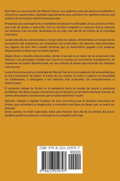 Este libro es una creación de Manuel García, una auténtica mina de placeres prohibidos y encuentros apasionados, diseñada especialmente para satisfacer los apetitos eróticos más audaces de los lectores adultos homosexuales. Prepárate para sumergirte en un torbellino de deseos inconfesables, en un universo erótico que arde de pasión y seducción. Con su escritura magnética y sensual, García estimula tus fantasías más secretas, llevándote en un viaje más allá de los límites de la intimidad masculina. La obra desafía las convenciones y rompe todos los tabúes, ofreciéndote un vistazo de los encuentros más explosivos, las conexiones más profundas y los placeres más extasiados. Las páginas de este libro revelan historias que te mantendrán pegado a las palabras, despertando un deseo que no podrás ignorar. Déjate llevar a mundos desconocidos, donde el pecado es el motor de las emociones más intensas. Los personajes creados por García se revelan en encuentros transgresores, en momentos de pasión desenfrenada, en una sinfonía de deseo que enciende tus fantasías más oscuras. La escritura provocativa y detallada de Manuel García es una explosión de sensualidad que te hará estremecer de placer. A través de sus relatos, te invita a explorar tu sexualidad sin inhibiciones, a entregarte a tus instintos más profundos, sin remordimientos ni restricciones. El presente trabajo de ficción es el pasaporte hacia un mundo de lujuria y aventuras prohibidas. No dejes escapar esta lectura que te llevará a un territorio de placer intenso, de sueños descarados y sensaciones que te harán estremecer la piel. Siéntate, relájate y regálate el placer de vivir una lectura que te brindará emociones sin límites, que estimulará tu imaginación y encenderá una llama de deseo que no podrá ser domada. Estos cuentos te están esperando, listos para llevarte más allá de los límites del placer, donde la pasión es soberana y el éxtasis es tu compañera de viaje.
