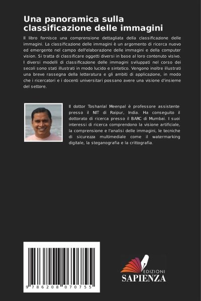 Il libro fornisce una comprensione dettagliata della classificazione delle immagini. La classificazione delle immagini è un argomento di ricerca nuovo ed emergente nel campo dell'elaborazione delle immagini e della computer vision. Si tratta di classificare oggetti diversi in base al loro contenuto visivo. I diversi modelli di classificazione delle immagini sviluppati nel corso dei secoli sono stati illustrati in modo lucido e sintetico. Vengono inoltre illustrati una breve rassegna della letteratura e gli ambiti di applicazione, in modo che i ricercatori e i docenti universitari possano avere una visione d'insieme del settore.