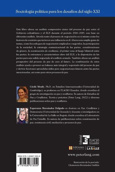 Este libro ofrece un análisis comprensivo único del proceso de paz entre el Gobierno colombiano y el ELN durante el periodo 2010¿2019, con base en diferentes análisis. Aborda tanto el proceso de negociación en sí mismo como los factores de contexto que tuvieron una infl uencia en él. Abarca una amplia gama de temas, como los enfoques de negociación empleados y sugeridos, la participación de la sociedad, la estrategia comunicacional de las partes, consideraciones de género, la construcción de confi anza, el primer cese al fuego bilateral entre las partes, la estructura y características clave del ELN, y la disposición de las partes para una salida negociada al confl icto armado. También ofrece un análisis prospectivo del proceso de paz de cara al futuro. La combinación de estos análisis ayuda a proveer un balance más integral y soportado del proceso de paz y derivar lecciones aprendidas útiles para negociaciones futuras entre las partes mencionadas, así como para otros procesos de paz. "Este libro es un recurso invaluable para cualquier persona interesada en comprender las complejidades y oportunidades del proceso de paz entre el Gobierno colombiano y el ELN. Lleno de reflexiones profundas y lecciones aprendidas de mucha relevancia para el proceso que empezó en 2022 y muchos otros procesos del mundo, con recomendaciones concretas y acertadas, el libro ofrece perspectivas diversas e interdisciplinarias con un número impresionante de entrevistas con actores clave ¿ poniendo su voz en el centro." ¿Dra. Sophie Haspeslagh, docente, King¿s College London "Un libro indispensable para conocer al ELN, las transformaciones que ha experimentado en los últimos años en medio del escalamiento de múltiples formas de violencia y el alcance de su propuesta de definir los contenidos de la agenda de negociación con base en la participación de la sociedad. Una mirada que rompe con los prejuicios que se han construido sobre la imposibilidad de negociar con el ELN poniendo de presente, con rigor académico y realismo político, las dificultades y los desafíos que plantea el hacer de la negociación un camino posible hacia la democratización integral de la sociedad. Libro necesario para entender una paz necesaria para cerrar definitivamente el ciclo de las guerras insurgentes en Colombia." ¿Dr. Jaime Zuluaga, docente investigador, Universidad Externado de Colombia "Una paz aplazada, urgente y necesaria. Tres palabras juntas que describen una percepción generalizada en los círculos políticos, académicos y de opinión informada, aunque el acostumbramiento a la violencia nos haya llevado a pensar que podíamos sobrevivir con este incendio, alimentado por rescoldos y puntos calientes sin apagar. Más que un libro, Cécile y Esperanza, sus editoras, nos ofrecen un estudio académico no exento de sentido crítico, juicioso y contrastado con connotadas fuentes de conocimiento y opinión sobre el conflicto y las paces intentadas con esta insurgencia, la última que sobrevive a la eclosión guerrillera de la década de los sesenta, alentada por el ardor revolucionario de la Cuba liberada. Hoy cuando se intenta un nuevo proceso, en un contexto más decidido hacia la paz negociada, este libro cobra vigencia, frescura y despierta interés. Si este libro no existiera habría de ser escrito, sin atenuantes." ¿Carlos Arturo Velandia, promotor de paz