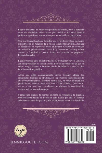 Eleanor Daventry ha entrado en posesión de dinero, pero la herencia tiene una condición: debe casarse para recibirlo. La tenaz Eleanor prefiere ser profesora antes que aceptar a un marido al que no ama. Stratford Tunstall acaba de descubrir que su predecesor legó las tierras sin restricción de herencia de la finca a la señorita Daventry. Aunque es escéptico con respecto al amor, el hombre es capaz de reconocer una solución práctica cuando la ve. Él y la señorita Daventry deben casarse, y Stratford no pierde tiempo en presentar su propuesta. Estando borracho. Eleanor rechaza tanto a Stratford como su propuesta y huye a Londres, con la esperanza de no volver a verlo. Pero no es consciente de que su mejor amiga conoce a Stratford desde la infancia y que las dos familias son inseparables. Ahora que están constantemente juntos, Eleanor admira las magistrales disculpas de Stratford, sin importarle la frecuencia con la que debe pronunciarlas. Stratford admite que, en contra de todas sus predicciones, Eleanor tiene éxito con la alta sociedad. Qué suerte. Ahora, si tan sólo sus pretendientes no sintieran la necesidad de recurrir a él en busca de consejo. Cuando una alianza de fuerzas amenaza la reputación de Eleanor, Stratford debe decidir si merece la pena luchar por ella. Y Eleanor debe convencerse de que su ayuda en su rescate es un acto inspirado por el amor.