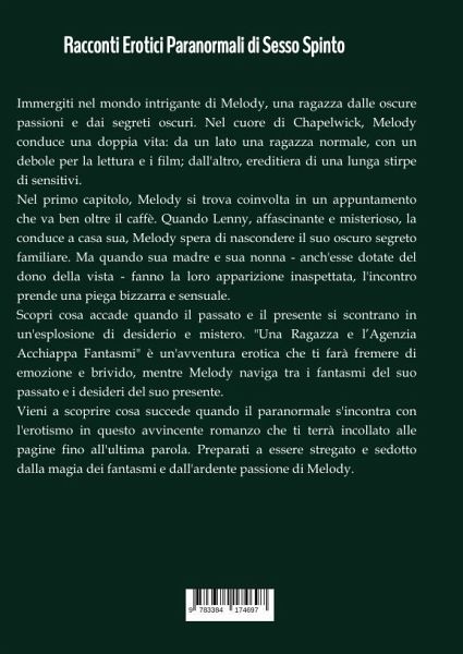 Immergiti nel mondo intrigante di Melody, una ragazza dalle oscure passioni e dai segreti oscuri. Nel cuore di Chapelwick, Melody conduce una doppia vita: da un lato una ragazza normale, con un debole per la lettura e i film; dall'altro, ereditiera di una lunga stirpe di sensitivi.Nel primo capitolo, Melody si trova coinvolta in un appuntamento che va ben oltre il caffè. Quando Lenny, affascinante e misterioso, la conduce a casa sua, Melody spera di nascondere il suo oscuro segreto familiare. Ma quando sua madre e sua nonna - anch'esse dotate del dono della vista - fanno la loro apparizione inaspettata, l'incontro prende una piega bizzarra e sensuale.Scopri cosa accade quando il passato e il presente si scontrano in un'esplosione di desiderio e mistero. "Una Ragazza e l'Agenzia Acchiappa Fantasmi" è un'avventura erotica che ti farà fremere di emozione e brivido, mentre Melody naviga tra i fantasmi del suo passato e i desideri del suo presente.Vieni a scoprire cosa succede quando il paranormale s'incontra con l'erotismo in questo avvincente romanzo che ti terrà incollato alle pagine fino all'ultima parola. Preparati a essere stregato e sedotto dalla magia dei fantasmi e dall'ardente passione di Melody.