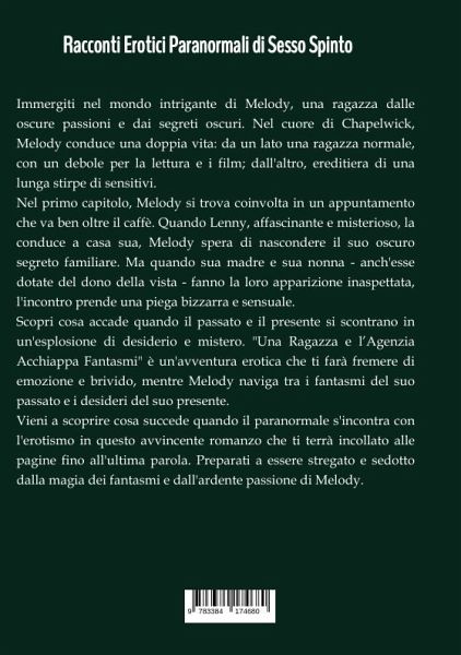 Immergiti nel mondo intrigante di Melody, una ragazza dalle oscure passioni e dai segreti oscuri. Nel cuore di Chapelwick, Melody conduce una doppia vita: da un lato una ragazza normale, con un debole per la lettura e i film; dall'altro, ereditiera di una lunga stirpe di sensitivi.Nel primo capitolo, Melody si trova coinvolta in un appuntamento che va ben oltre il caffè. Quando Lenny, affascinante e misterioso, la conduce a casa sua, Melody spera di nascondere il suo oscuro segreto familiare. Ma quando sua madre e sua nonna - anch'esse dotate del dono della vista - fanno la loro apparizione inaspettata, l'incontro prende una piega bizzarra e sensuale.Scopri cosa accade quando il passato e il presente si scontrano in un'esplosione di desiderio e mistero. "Una Ragazza e l'Agenzia Acchiappa Fantasmi" è un'avventura erotica che ti farà fremere di emozione e brivido, mentre Melody naviga tra i fantasmi del suo passato e i desideri del suo presente.Vieni a scoprire cosa succede quando il paranormale s'incontra con l'erotismo in questo avvincente romanzo che ti terrà incollato alle pagine fino all'ultima parola. Preparati a essere stregato e sedotto dalla magia dei fantasmi e dall'ardente passione di Melody.