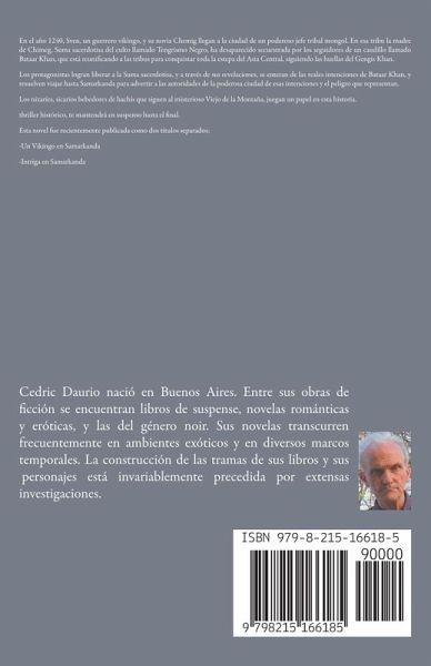 En el año 1240, Sven, un guerrero vikingo, y su novia Chemig llegan a la ciudad de un poderoso jefe tribal mongol. En esa tribu la madre de Chimeg, Suma sacerdotisa del culto llamado Tengrismo Negro, ha desaparecido secuestrada por los seguidores de un caudillo llamado Bataar Khan, que está reunificando a las tribus para conquistar toda la estepa del Asia Central, siguiendo las huellas del Gengis Khan. Los protagonistas logran liberar a la Suma sacerdotisa, y a través de sus revelaciones, se enteran de las reales intenciones de Bataar Khan, y resuelven viajar hasta Samarkanda para advertir a las autoridades de la poderosa ciudad de esas intenciones y el peligro que representan. Los nizaríes, sicarios bebedores de hachís que siguen al misterioso Viejo de la Montaña, juegan un papel en esta historia. thriller histórico, te mantendrá en suspenso hasta el final. Esta novel fue recientemente publicada como dos títulos separados: -Un Vikingo en Samarkanda -Intriga en Samarkanda