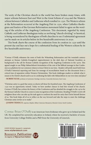 The unity of the Christian church in the world has been broken many times, with major schisms between East and West in the Great Schism of 1054 and the Western schism between Catholics and Lutherans which resulted in 1530. The Western schism at the Reformation occurred at the Augsburg Diet in 1530, when Catholics theologians and leaders of the German Reformation movement failed to agree on the wording of the articles of the Augsburg Confession. This document, regarded by many Catholic and Lutheran theologians today as not being ""church-dividing"" or heretical, is being reconsidered by theologians of both churches to see if substantial agreement can be made on its articles before its five hundredth anniversary in 2030. This book charts the course of the confession from its creation in 1530 until the present day and lays out a hope for a substantial healing of the Western schism by its five hundredth anniversary.