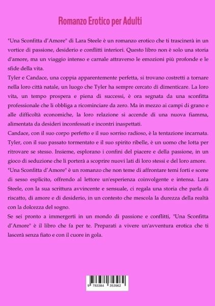 "Una Sconfitta d'Amore" di Lara Steele è un romanzo erotico che ti trascinerà in un vortice di passione, desiderio e conflitti interiori. Questo libro non è solo una storia d'amore, ma un viaggio intenso e carnale attraverso le emozioni più profonde e le sfide della vita.Tyler e Candace, una coppia apparentemente perfetta, si trovano costretti a tornare nella loro città natale, un luogo che Tyler ha sempre cercato di dimenticare. La loro vita, un tempo prospera e piena di successi, è ora segnata da una sconfitta professionale che li obbliga a ricominciare da zero. Ma in mezzo ai campi di grano e alle difficoltà economiche, la loro relazione si accende di una nuova fiamma, alimentata da desideri inconfessati e incontri inaspettati.Candace, con il suo corpo perfetto e il suo sorriso radioso, è la tentazione incarnata. Tyler, con il suo passato tormentato e il suo spirito ribelle, è un uomo che lotta per ritrovare se stesso. Insieme, esplorano i confini del piacere e della passione,in un gioco di seduzione che li porterà a scoprire nuovi lati di loro stessi e del loro amore."Una Sconfitta d'Amore" è un romanzo che non teme di affrontare temi forti e scene di sesso esplicito, offrendo al lettore un'esperienza coinvolgente e intensa. Lara Steele, con la sua scrittura avvincente e sensuale, ci regala una storia che parla di riscatto, di amore e di desiderio, in un contesto che mescola la durezza della realtà con la dolcezza del sogno.Se sei pronto a immergerti in un mondo di passione e conflitti, "Una Sconfitta d'Amore" è il libro che fa per te. Preparati a vivere un'avventura erotica che ti lascerà senza fiato e con il cuore in gola.