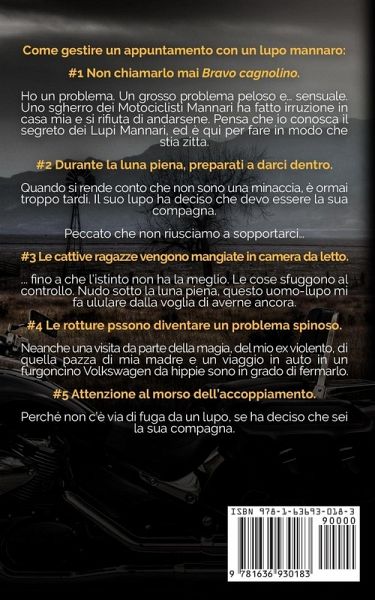 Come gestire un appuntamento con un lupo mannaro: #1 Non chiamarlo mai Bravo cagnolino. Ho un problema. Un grosso problema peloso e... sensuale. Uno sgherro dei Motociclisti Mannari ha fatto irruzione in casa mia e si rifiuta di andarsene. Pensa che io conosca il segreto dei Lupi Mannari, ed è qui per fare in modo che stia zitta. #2 Durante la luna piena, preparati a darci dentro. Quando si rende conto che non sono una minaccia, è ormai troppo tardi. Il suo lupo ha deciso che devo essere la sua compagna. Peccato che non riusciamo a sopportarci... # 3 Le cattive ragazze vengono mangiate in camera da letto. ... fino a che l'istinto non ha la meglio. Le cose sfuggono al controllo. Nudo sotto la luna piena, questo uomo-lupo mi fa ululare dalla voglia di averne ancora. # 4 Le rotture pssono diventare un problema spinoso. Neanche una visita da parte della magia, del mio ex violento, di quella pazza di mia madre e un viaggio in auto in un furgoncino Volkswagen da hippie sono in grado di fermarlo. #5 Attenzione al morso dell'accoppiamento. Perché non c'è via di fuga da un lupo, se ha deciso che sei la sua compagna.