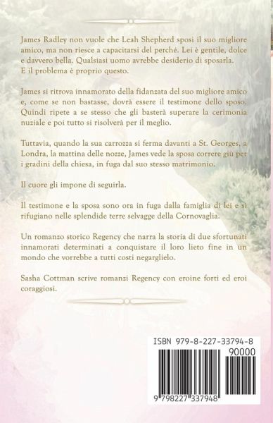 James Radley non vuole che Leah Shepherd sposi il suo migliore amico, ma non riesce a capacitarsi del perché. Lei è gentile, dolce e davvero bella. Qualsiasi uomo avrebbe desiderio di sposarla. E il problema è proprio questo. James si ritrova innamorato della fidanzata del suo migliore amico e, come se non bastasse, dovrà essere il testimone dello sposo. Quindi ripete a se stesso che gli basterà superare la cerimonia nuziale e poi tutto si risolverà per il meglio. Tuttavia, quando la sua carrozza si ferma davanti a St. Georges, a Londra, la mattina delle nozze, James vede la sposa correre giù per i gradini della chiesa, in fuga dal suo stesso matrimonio. Il cuore gli impone di seguirla. Il testimone e la sposa sono ora in fuga dalla famiglia di lei e si rifugiano nelle splendide terre selvagge della Cornovaglia. Un romanzo storico Regency che narra la storia di due sfortunati innamorati determinati a conquistare il loro lieto fine in un mondo che vorrebbe a tutti costi negarglielo. Una Sposa in Fuga è un romanzo autoconclusivo della serie Il Duca de Strathmore. Sasha Cottman scrive romanzi Regency con eroine forti ed eroi coraggiosi.