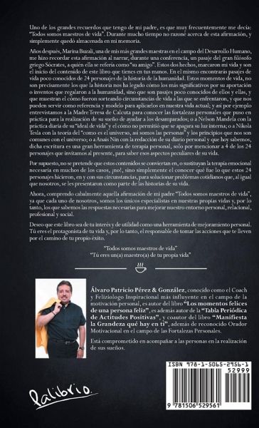 Uno de los grandes recuerdos que tengo de mi padre, es que muy frecuentemente me decía: "Todos somos maestros de vida". Durante mucho tiempo no razoné acerca de esta afirmación, y simplemente quedó almacenada en mi memoria. Años después, Marina Buzali, una de mis más grandes maestras en el campo del Desarrollo Humano, me hizo recordar esta afirmación al narrar, durante una conferencia, un pasaje del gran filósofo griego Sócrates, a quién ella se refería como "su amigo". Estos dos hechos, marcaron mi vida y son el inicio del contenido de este libro que tienes en tus manos. En el mismo encontrarás pasajes de vida poco conocidos de 24 personajes de la historia de la humanidad. Estos momentos de vida, no son precisamente los que la historia nos ha legado cómo los más significativos por su aportación o inventos que regalaron a la humanidad, sino que son pasajes poco conocidos de ellos y ellas, y que muestran el cómo fueron sorteando circunstancias de vida a las que se enfrentaron, y que nos pueden servir como referencia y modelo para aplicarlos en nuestra vida actual; y así por ejemplo entrevistamos a la Madre Teresa de Calcuta para conocer las fortalezas personales que puso en práctica para la realización de su sueño de ayudar a los desamparados; o a Nelson Mandela con la práctica diaria de su "ideal de vida" y el cómo no permitió que se apagara su luz interna; o a Nikola Tesla con la teoría del "como es el universo, así somos las personas" y los principios que nos son comunes con el universo; o a Anais Nin con la redacción de su diario personal y que hoy sabemos, dicha escritura es una gran herramienta de terapia personal, solo por mencionar a 4 de los 24 personajes que invitamos al presente, para saber esos aspectos peculiares de su vida. Por supuesto, no se pretende que estos contenidos se conviertan en, o sustituyan la terapia emocional necesaria en muchos de los casos, ¡no!, sino simplemente el conocer qué fue lo que estos 24 personajes hicieron, en y con sus circunstancias, para solucionar problemas cotidianos que, al igual que nosotros, se les presentaron como parte de las historias de su vida. Ahora, comprendo cabalmente aquella afirmación de mi padre "Todos somos maestros de vida", ya que cada uno de nosotros, somos los únicos especialistas en nuestras propias vidas y, por lo tanto, los que sabemos las respuestas necesarias para mejorar nuestro entorno personal, relacional, profesional y social. Deseo que este libro sea de tu interés y de utilidad como una herramienta de mejoramiento personal. Tú eres el protagonista de tu vida y, por lo tanto, el responsable de tomar las acciones que te lleven por el camino de tu propio éxito. "Todos somos maestros de vida" "Tú eres un(a) maestro(a) de tu propia vida"