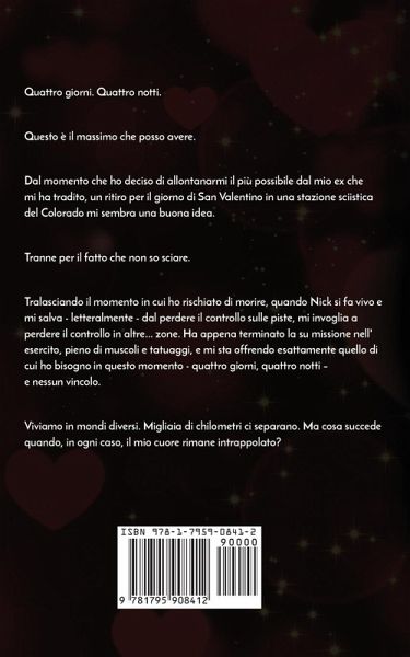 Quattro giorni. Quattro notti. Questo è il massimo che posso avere. Dal momento che ho deciso di allontanarmi il più possibile dal mio ex che mi ha tradito, un ritiro per il giorno di San Valentino in una stazione sciistica del Colorado mi sembra una buona idea. Tranne per il fatto che non so sciare. Tralasciando il momento in cui ho rischiato di morire, quando Nick si fa vivo e mi salva - letteralmente - dal perdere il controllo sulle piste, mi invoglia a perdere il controllo in altre... zone. Ha appena terminato la su missione nell'esercito, pieno di muscoli e tatuaggi, e mi sta offrendo esattamente quello di cui ho bisogno in questo momento - quattro giorni, quattro notti - e nessun vincolo. Viviamo in mondi diversi. Migliaia di chilometri ci separano. Ma cosa succede quando, in ogni caso, il mio cuore rimane intrappolato?
