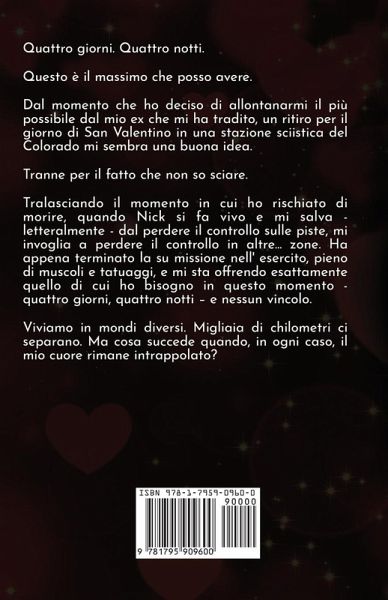 Quattro giorni. Quattro notti. Questo è il massimo che posso avere. Dal momento che ho deciso di allontanarmi il più possibile dal mio ex che mi ha tradito, un ritiro per il giorno di San Valentino in una stazione sciistica del Colorado mi sembra una buona idea. Tranne per il fatto che non so sciare. Tralasciando il momento in cui ho rischiato di morire, quando Nick si fa vivo e mi salva - letteralmente - dal perdere il controllo sulle piste, mi invoglia a perdere il controllo in altre... zone. Ha appena terminato la su missione nell'esercito, pieno di muscoli e tatuaggi, e mi sta offrendo esattamente quello di cui ho bisogno in questo momento - quattro giorni, quattro notti - e nessun vincolo. Viviamo in mondi diversi. Migliaia di chilometri ci separano. Ma cosa succede quando, in ogni caso, il mio cuore rimane intrappolato?