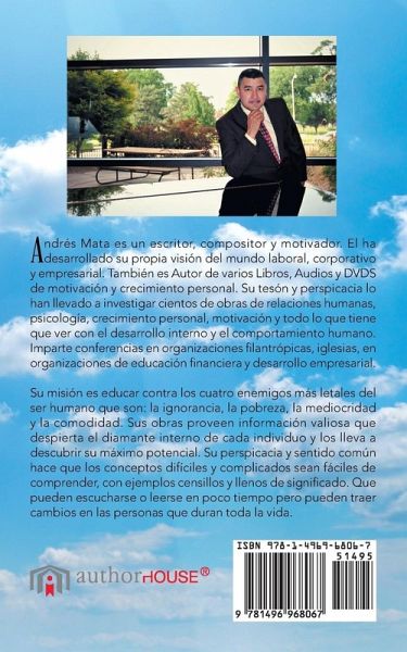 Andrés Mata es un escritor, compositor y motivador. El ha desarrollado su propia visión del mundo laboral, corporativo y empresarial. También es Autor de varios Libros, Audios y DVDS de motivación y crecimiento personal. Su tesón y perspicacia lo han llevado a investigar cientos de obras de relaciones humanas, psicología, crecimiento personal, motivación y todo lo que tiene que ver con el desarrollo interno y el comportamiento humano. Imparte conferencias en organizaciones filantrópicas, iglesias, en organizaciones de educación financiera y desarrollo empresarial. Su misión es educar contra los cuatro enemigos más letales del ser humano que son: la ignorancia, la pobreza, la mediocridad y la comodidad. Sus obras proveen información valiosa que despierta el diamante interno de cada individuo y los lleva a descubrir su máximo potencial. Su perspicacia y sentido común hace que los conceptos difíciles y complicados sean fáciles de comprender, con ejemplos censillos y llenos de significado. Que pueden escucharse o leerse en poco tiempo pero pueden traer cambios en las personas que duran toda la vida.