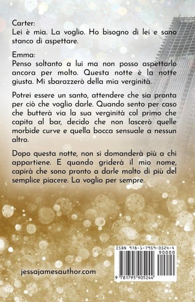 Carter: Lei è mia. La voglio. Ho bisogno di lei e sono stanco di aspettare. Emma: Penso soltanto a lui ma non posso aspettarlo ancora per molto. Questa notte è la notte giusta. Mi sbarazzerò della mia verginità. Potrei essere un santo, attendere che sia pronta per ciò che voglio darle. Quando sento per caso che butterà via la sua verginità col primo che capita al bar, decido che non lascerò quelle morbide curve e quella bocca sensuale a nessun altro. Dopo questa notte, non si domanderà più a chi appartiene. E quando griderà il mio nome, capirà che sono pronto a darle molto di più del semplice piacere. La voglio per sempre.