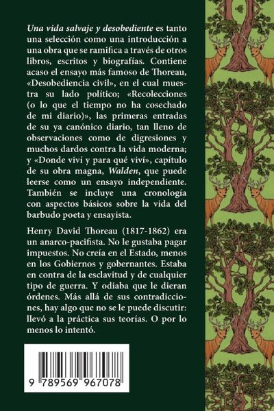 Una vida salvaje y desobediente es tanto una selección como una introducción a una obra que se ramifica a través de otros libros, escritos y biografías. Contiene acaso el ensayo más famoso de Thoreau, Desobediencia civil, en el cual muestra su lado político; Recolecciones (o lo que el tiempo no ha cosechado de mi diario), las primeras entradas de su ya canónico diario, tan lleno de observaciones como de digresiones y muchos dardos -de madera- contra la vida moderna; y Donde viví y para qué viví, capítulo de su obra magna, Walden, pero que a su vez puede leerse como un ensayo independiente. También se incluye una cronología con aspectos básicos sobre la vida del barbudo poeta y ensayista.