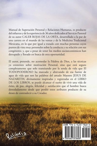 Manual de Superación Personal y Relaciones Humanas, es producto del esfuerzo y de la experiencia de 36 años dedicados al Servicio Pastoral de su autor CALEB ROJAS DE LA ORTA, desarrollado a la par de una carrera en el mundo de las ventas y de la Medicina Tradicional Mexicana, en lo que por igual a tratado con muchas personas cuyos puntos de vista muy personales sobre la conducta y su relación con sus congéneres; y, que a pesar de tener los medios socioeconómicos han derrapado y llorado en busca de otra oportunidad. El autor, pretende, no acomodar la Palabra de Dios, a las técnicas ya existentes sobre motivación Personal, sino que está seguro completamente que solo transitando por la senda de vida que El TODOPODEROSO ha marcado y abrevando de esa fuente de agua de vida que son las palabras del amado Maestro JESUS DE NAZARETH, divinamente inspiradas y registradas en el LIBRO DE LOS LIBROS, se puede alcanzar el sueño de vivir una vida de éxito, de paz, alegría, felicidad y satisfacción que el hombre busca denodadamente desde que perdió estos atributos producto de su deseo de contradecir a su Creador.