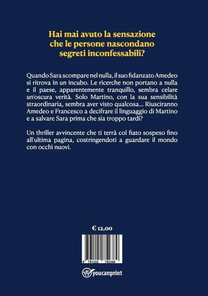 Quando Sara Marini svanisce senza lasciare traccia, il suo fidanzato Amedeo è disposto a tutto pur di ritrovarla. Le ricerche ufficiali brancolano nel buio e il paese, apparentemente sereno, inizia a rivelare le sue inquietanti sfaccettature. Solo Martino, un bambino con una percezione unica del mondo, sembra aver colto un dettaglio sfuggito a tutti. Riuscirà Amedeo a decifrare il linguaggio di Martino e a svelare la verità, affrontando un'oscura minaccia che si cela dietro una facciata di normalità?