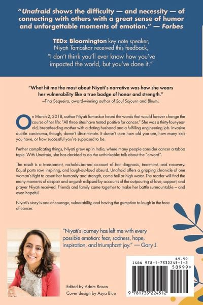 At 34, Niyati Tamaskar was diagnosed with cancer while she was breastfeeding her second child. As an engineer, she realized that she was a statistical outlier because this only occurs in 3% of lactating women. As an Indian, she came to realize the all-too-common truth that people with serious illness are often shunned and discussing a disease like cancer is frowned up. She chose not to be silent and challenged the cultural norm by writing a memoir about her journey. The result is a transparent, no-holds-barred account of her diagnosis, treatment, and recovery. Equal parts raw, inspiring, and laugh-out-loud absurd, Unafraid offers a gripping chronicle of one woman's fight to assert her humanity and strength, come hell or high water. The reader will find the many moments of despair and anguish eclipsed by accounts of the outpouring of love, support, and prayer Tamaskar received. Friends and family came together to make her battle surmountable-and even hopeful. Tamaskar's story is one of courage, vulnerability, and having the gumption to laugh in the face of cancer. All proceeds of the book are donated to the American Cancer Society.