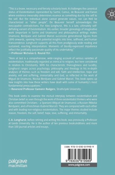 This book seeks to examine the mutual interplay between existentialism and Christian belief as seen through the work of three existentialist thinkers who were also committed Christians - a Spaniard (Miguel de Unamuno), a Russian (Nikolai Berdyaev), and a Frenchman (Gabriel Marcel). They are compared with each other and with leading non-religious existentialists. The major themes studied include reason, freedom, the self, belief, hope, love, suffering, and immortality.
