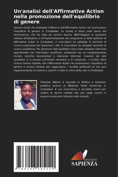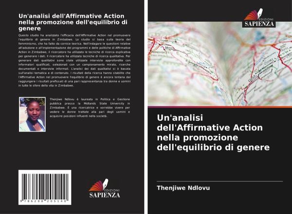 Questo studio ha analizzato l'efficacia dell'Affirmative Action nel promuovere l'equilibrio di genere in Zimbabwe. Lo studio si basa sulla teoria del femminismo, che ha fatto da cornice teorica. Nell'indagare le questioni relative all'adozione e all'implementazione dei programmi e delle politiche di Affirmative Action in Zimbabwe, il ricercatore ha utilizzato le tecniche di ricerca esplicativa per generare i dati. Il ricercatore ha utilizzato tecniche di ricerca qualitativa. Per generare dati qualitativi sono state utilizzate interviste approfondite con informatori qualificati, selezionati con un campionamento mirato, ricerche documentali e interviste informali. L'analisi dei dati qualitativi si è basata sull'analisi tematica e di contenuto. I risultati della ricerca hanno stabilito che l'Affirmative Action nel promuovere l'equilibrio di genere è ancora lontana dal raggiungere i risultati prefissati di una pari rappresentanza tra donne e uomini in tutte le sfere della vita in Zimbabwe.