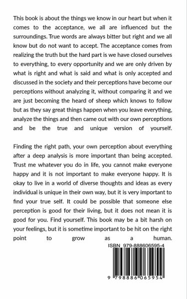 This book is about the things we know in our heart but when it comes to the acceptance, we all are influenced but the surroundings. True words are always bitter but right and we all know but do not want to accept. The acceptance comes from realizing the truth but the hard part is we have closed ourselves to everything, to every opportunity and we are only driven by what is right and what is said and what is only accepted and discussed in the society and their perceptions have become our perceptions without analyzing it, without comparing it and we are just becoming the heard of sheep which knows to follow but as they say great things happen when you leave everything, analyze the things and then came out with our own perceptions and be the true and unique version of yourself. Finding your own path, your own perception about everything after a deep analysis is more important than being accepted. Trust me whatever you do in life, you cannot make everyone happy and it is not important to make everyone happy. It is okay to live in a world of diverse thoughts and ideas as every individual is unique in their own way, but it is very important to find your true self. It could be possible that someone else perception is good for their living, but it does not mean it is good for you. Find yourself. This book may be a bit harsh on your feelings, but it is sometime important to be hit on the right point to grow as a human.