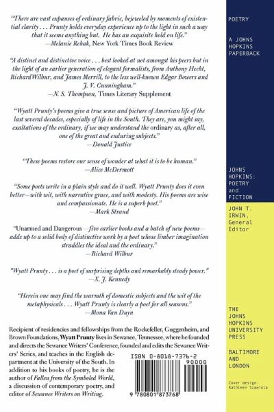 Wyatt Prunty's poems have been described as "quiet, reflective, and of unexpected depth" (Howard Nemerov), "both artful and truthful" (Donald Justice), "a triumph of controlled and understated but powerful emotion" (Anthony Hecht), and "illuminated by a language both skewed and precise" (Walker Percy). As a poet, Prunty -- who is also the founder and director of the Sewanee Writers' Conference -- has been praised for "his powerful imagination in the specifics of ordinary details, suggesting persuasively that the near at hand is as unexplored and full of wonder as the far ends of the universe" (Publishers Weekly) and called "one of the most gifted and technically accomplished American poets of the post-World War II generation" (Southern Review). An elegant overview of his career until now, Unarmed and DANGEROUS: New and Selected Poems features selections from Wyatt Prunty's five previous books -- The Times Between (1982); What Women Know, What Men Believe (1986); Balance as Belief (1989); Run of the House (1993); and Since the Noon Mail Stopped (1997), all published by the Johns Hopkins University Press -- as well as new poems that demonstrate the poet's wide-ranging and sympathetic imagination. Prunty's new work includes moving evocations of childhood ("A Child's Christmas in Georgia, 1953"), richly detailed poems about ordinary people and situations ("The Downtown Bus"), and even a probing meditation on the fairy tale "Jack and the Beanstalk" ("Annals of Jack"). Together, the poems gathered in this volume afford a clear portrait of a major American poet whose distinctive voice and vision have earned him the admiration and respect of such contemporaries as Richard Wilbur, X. J.Kennedy, and Mark Strand and marked him as "a writer who has mastered his craft, Ýä poet Ýwhö can look at the life most of us take for granted and show us what is most real, most precious in it" (The Commercial Appeal).