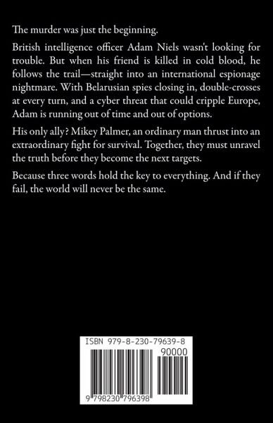 The murder was just the beginning. British intelligence officer Adam Niels wasn't looking for trouble. But when his friend is killed in cold blood, he follows the trail-straight into an international espionage nightmare. With Belarusian spies closing in, double-crosses at every turn, and a cyber threat that could cripple Europe, Adam is running out of time and out of options. His only ally? Mikey Palmer, an ordinary man thrust into an extraordinary fight for survival. Together, they must unravel the truth before they become the next targets. Because three words hold the key to everything. And if they fail, the world will never be the same.