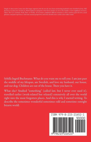 Simply 21 short stories (some more like longer vignettes) that do not shy away from mentioning mankind's most cherished activity. Still, the focus is on the story not the sex. Hotel employees and guests, wine-lovers and dry (or not so dry) banker, or just neighbours in Greece, Tokyo, The U.S., Germany, Perth, Paris, or Sweden: all encounter completely different situations in their common quest for love, carnal pleasures, and peak experiences. And some unusual perspectives and twists should create a smile in the reader's mind.