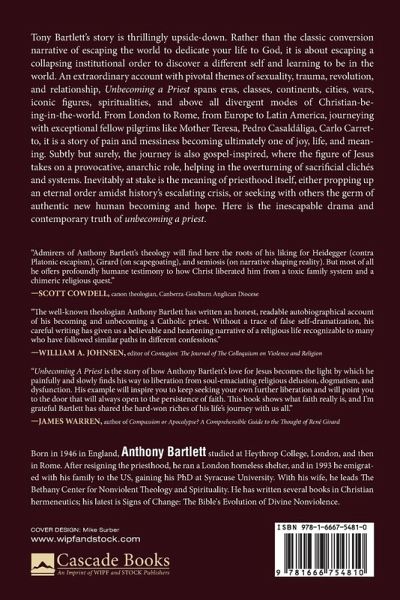 Tony Bartlett's story is thrillingly upside-down. Rather than the classic conversion narrative of escaping the world to dedicate your life to God, it is about escaping a collapsing institutional order to discover a different self and learning to be in the world. An extraordinary account with pivotal themes of sexuality, trauma, revolution, and relationship, Unbecoming a Priest spans eras, classes, continents, cities, wars, iconic figures, spiritualities, and above all divergent modes of Christian-being-in-the-world. From London to Rome, from Europe to Latin America, journeying with exceptional fellow pilgrims like Mother Teresa, Pedro Casaldaliga, Carlo Carretto, it is a story of pain and messiness becoming ultimately one of joy, life, and meaning. Subtly but surely, the journey is also gospel-inspired, where the figure of Jesus takes on a provocative, anarchic role, helping in the overturning of sacrificial cliches and systems. Inevitably at stake is the meaning of priesthood itself, either propping up an eternal order amidst history's escalating crisis, or seeking with others the germ of authentic new human becoming and hope. Here is the inescapable drama and contemporary truth of unbecoming a priest.