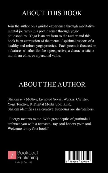 Join the author on a guided experience through meditative mental journeys in a poetic sense through yogic philosophies. Yoga is an art form to the author and this book is an expression of the mental / spiritual aspects of a healthy and robust yoga practice. Each poem is focused on a feature- whether that be a perspective, a characteristic, a moral, an ethic, or a personal value.