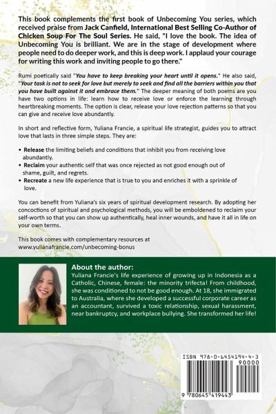This book complements the first book of Unbecoming You series, which received praise from Jack Canfield, International Best Selling Co-Author of Chicken Soup For The Soul Series. He said, "I love the book. The idea of Unbecoming You is brilliant. We are in the stage of development where people need to do deeper work, and this is deep work. I applaud your courage for writing this work and inviting people to go there." Rumi poetically said "You have to keep breaking your heart until it opens." He also said, "Your task is not to seek for love but merely to seek and find all the barriers within you that you have built against it and embrace them." The deeper meaning of both poems are you have two options in life: learn how to receive love or enforce the learning through heartbreaking moments. The option is clear, release your love rejection patterns so that you can give and receive love abundantly. In short and reflective form, Yuliana Francie, a spiritual life strategist, guides you to attract love that lasts in three simple steps. They are: 1. Release the limiting beliefs and conditions that inhibit you from receiving love abundantly. 2. Reclaim your authentic self that was once rejected as not good enough out of shame, guilt, and regrets. 3. Recreate a new life experience that is true to you and enriches it with a sprinkle of love. You can benefit from Yuliana's six years of spiritual development research. By adopting her concoctions of spiritual and psychological methods, you will be emboldened to reclaim your self-worth so that you can show up authentically, heal inner wounds, and have it all in life on your own terms. This book comes with complementary resources at www.yulianafrancie.com/unbecoming-bonus