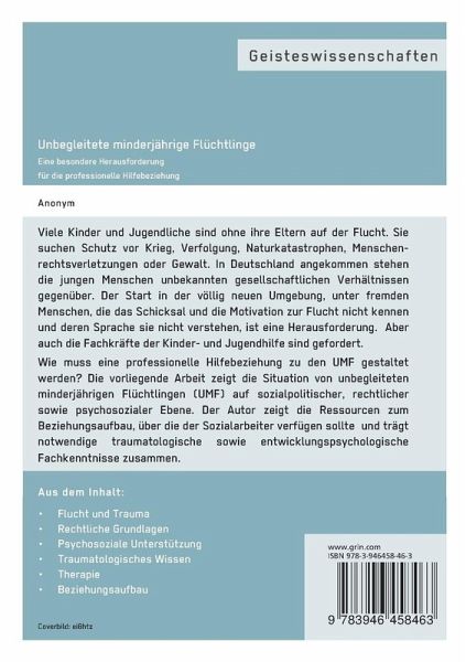 Viele Kinder und Jugendliche sind ohne ihre Eltern auf der Flucht. Sie suchen Schutz vor Krieg, Verfolgung, Naturkatastrophen, Menschen-rechtsverletzungen oder Gewalt. In Deutschland angekommen stehen die jungen Menschen unbekannten gesellschaftlichen Verhältnissen gegenüber. Der Start in der völlig neuen Umgebung, unter fremden Menschen, die das Schicksal und die Motivation zur Flucht nicht kennen und deren Sprache sie nicht verstehen, ist eine Herausforderung. Aber auch die Fachkräfte der Kinder- und Jugendhilfe sind gefordert.Wie muss eine professionelle Hilfebeziehung zu den UMF gestaltet werden? Die vorliegende Arbeit zeigt die Situation von unbegleiteten minderjährigen Flüchtlingen (UMF) auf sozialpolitischer, rechtlicher sowie psychosozialer Ebene. Der Autor zeigt die Ressourcen zum Beziehungsaufbau, über die der Sozialarbeiter verfügen sollte und trägt notwendige traumatologische sowie entwicklungspsychologische Fachkenntnisse zusammen.Aus dem Inhalt: -Flucht und Trauma-Rechtliche Grundlagen-Psychosoziale Unterstützung-Traumatologisches Wissen-Therapie-BeziehungsaufbauThe current paper aims to show the situation of separated children from a legal, socio-political and psychosocial angle and wants to discuss the matter of how to frame a professional help relationship to them. Resources for relation building and further professional knowledge in traumatological and developmental psychology are needed for this purpose. In this process these two aspects are not only annotated with scholarly literature but rather also with an empirical research. This work is divided into five main parts. Section number two covers the social- political, legal and psycho-social situation of the separated children. The following segment constitutes the empirical research and summarizes the results. In the fourth paragraph the cornerstone of professional help relationship is presented. This contains structural conditions of the professional help relationship, followed by a segment about the psycho-social encouragements of the separated children. At the end the methodical aspects of work-relationship building and the required core competences for social workers are displayed. This thesis makes clear that the professional support of separated children is a very complex field of work. It presents the qualified specialists with a big challenge. It requires solid legal skills beside specialist knowledge of traumatology and developmental psychology.