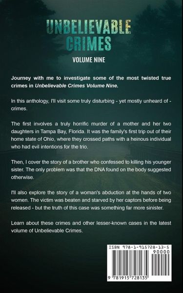 Journey with me to investigate some of the most twisted true crimes in Unbelievable Crimes Volume Nine. In this anthology, I'll visit some truly disturbing - yet mostly unheard of - crimes. The first involves a truly horrific murder of a mother and her two daughters in Tampa Bay, Florida. It was the family's first trip out of their home state of Ohio, where they crossed paths with a heinous individual who had evil intentions for the trio. Then, I cover the story of a brother who confessed to killing his younger sister. The only problem was that the DNA found on the body suggested otherwise. I'll also explore the story of a woman's abduction at the hands of two women. The victim was beaten and starved by her captors before being released - but the truth of this case was something far more sinister. Learn about these crimes and other lesser-known cases in the latest volume of Unbelievable Crimes. As always, please remember that this book covers real-life cases that include depictions of violence, abuse, and murder.