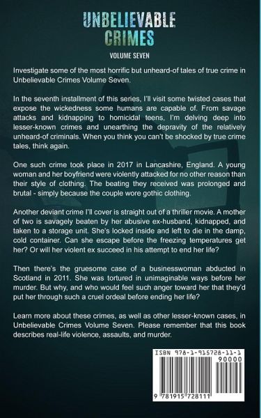 Investigate some of the most horrific but unheard-of tales of true crime in Unbelievable Crimes Volume Seven. In the seventh installment of this series, I'll visit some twisted cases that expose the wickedness some humans are capable of. From savage attacks and kidnapping to homicidal teens, I'm delving deep into lesser-known crimes and unearthing the depravity of the relatively unheard-of criminals. When you think you can't be shocked by true crime tales, think again. One such crime took place in 2017 in Lancashire, England. A young woman and her boyfriend were violently attacked for no other reason than their style of clothing. The beating they received was prolonged and brutal - simply because the couple wore gothic clothing. Another deviant crime I'll cover is straight out of a thriller movie. A mother of two is savagely beaten by her abusive ex-husband, kidnapped, and taken to a storage unit. She's locked inside and left to die in the damp, cold container. Can she escape before the freezing temperatures get her? Or will her violent ex succeed in his attempt to end her life? Then there's the gruesome case of a businesswoman abducted in Scotland in 2011. She was tortured in unimaginable ways before her murder. But why, and who would feel such anger toward her that they'd put her through such a cruel ordeal before ending her life? Learn more about these crimes, as well as other lesser-known cases, in Unbelievable Crimes Volume Seven. Please remember that this book describes real-life violence, assaults, and murder. For those new to the series, Unbelievable Crimes is written by a former small-town journalist turned true crime enthusiast. The series tackles hard-to-hear true tales that evaded headline news (mostly) despite the (or perhaps because of) barbarity of the crime.