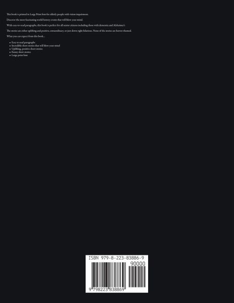 This book is printed in Large Print font for elderly people with vision impairment. Discover the most fascinating world history events that will blow your mind. With easy-to-read paragraphs, this book is perfect for all senior citizens including those with dementia and Alzheimer's The stories are either uplifting and positive, extraordinary, or just down right hilarious. None of the stories are horror-themed. What you can expect from this book...Easy to read paragraphs Incredible short stories that will blow your mind Uplifting, positive short stories Funny short stories Large print font