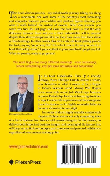 The word Rogue has many different meanings - some cautionary, others unflattering, and yet some whimsical and benevolent. In his book Unbelievable: Tales Of A Friendly Rogue, Pierre Philippe Dulude creates a whole, new definition of what it means to be a Rogue in today's business world. Mixing Will Rogers horse sense with sound Jack Welch-type business acumen, Dulude lays bare his riches to rags to riches to rags to riches life experience and his emergence from the shadow on his highly successful father to become a force in his own right. In a series of short, highly readable content-rich chapters Dulude weaves not only compelling tales of a life in business but does so with earnest integrity. In the process, he delivers both important business insights and meaningful life lessons that will help you to find your unique path to success and personal satisfaction regardless of your current starting point.