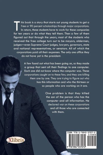 This book is a story that starts out young students to get a free or 90 percent scholarships through major corporations. In return, these students have to work for these companies for ten years or do what they tell them. Then a few of them figured out that through the years, most of the students who received the free college turn out to be mayors, aldermen, judgeseven Supreme Court judges, lawyers, governors, state and national representatives, or senators. All of which the corporations paid all their expenses. The only one office they do not have yet is the president. A few found out what has been going on, so they made a group that sent all their findings to one computer. Each one did not know where the computer was. These corporations caught on to these few, and they are killing them one by one. They are trying to figure out who has this information and who the thirteen or so people who are working on it are. One problem is that they killed the son of the person who has the computer and all information. He declared war on these corporations and all those who are connected with them.