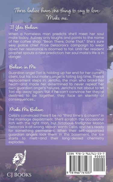 Three ladies have one thing to say to love: "Make me." If You Believe When a homeless man predicts she'll meet her soul mate today, Aubrey only laughs and points to the name of her coffee shop: "Bean There, Done That." She's sure sexy police chief Price Delacroix's campaign to wear down her resistance is doomed to fail. Until her resident prophet spouts a new prediction: her soul mate's life is in danger. Believe in Me Guardian angel Tori is holding up her end for her current client, but his soul mate's angel is failing big time. Then a replacement steps in: Jericho, the man who broke her heart-and made her determined to never repeat her own guardian angel's failures. Jericho's not about to let Tori slip away again. But if he can't convince her they're destined to be together, they face an eternity of consequences... Make Me Believe Celia's convinced there'll be no "third time's a charm" in the marriage department. She'll scratch the occasional itch with the right man, but flirtatious firefighter Mason Delacroix is all wrong. Mason wants Celia, and he's ready for something permanent. When their self-appointed guardian angels lock them in the basement, the ice starts to melt-and their long-denied chemistry explodes.