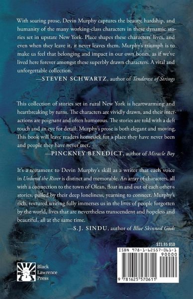 The linked stories in Unbend the River are set along a forested stretch of land between Lake Erie and the upper Allegheny River in Western New York, places dense with rivers, hills, and forest. The characters, all of whom are tied to a modern knife manufacturing plant, illustrate all the ways love and longing shapeshift over the course of a long life. A host of elderly hockey players, Franciscan Friars, loser heroes, budding conmen, and unintentional historians are all wired to search for meaning. Each flash their creative genius when fighting off idleness, anger, and disappointment. They build nightmare hotrods and race school buses; train wild dogs, homing pigeons, and dancing horses; and fight wildfires and grasshopper swarms. They crash headlong into the chaos, confusion, and confluence of their homes, never losing their energy to seek out the essential miracles hidden all around them.