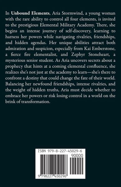 In Unbound Elements, Aria Stormwind, a young woman with the rare ability to control all four elements, is invited to the prestigious Elemental Military Academy. There, she begins an intense journey of self-discovery, learning to harness her powers while navigating rivalries, friendships, and hidden agendas. Her unique abilities attract both admiration and suspicion, especially from Kai Emberstone, a fierce fire elementalist, and Zephyr Stoneheart, a mysterious senior student. As Aria uncovers secrets about a prophecy that hints at a coming elemental confluence, she realizes she's not just at the academy to learn-she's there to confront a destiny that could change the fate of their world. Balancing her newfound friendships, intense rivalries, and the weight of hidden truths, Aria must decide whether to embrace her powers or risk losing control in a world on the brink of transformation.