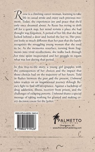 The true story of how a young family made choices between good and evil, while facing the destructive powers of poverty, generational curses and illness. From poverty, a drug epidemic, to prison, they emerge stronger. Life looks different for her now than it did for her as a struggling young woman. She's learned to take things slow instead of rushing full speed ahead, and in that she has found peace and joy she'd never thought possible. Still, in dreams, her mind drifts to a place she thought long buried. First in bits and pieces, and then with vivid, intrinsic detail, Reese recalls her time locked away in prison and the struggle to regain what was lost. In this story based on true events, a young girl comes to understand the impact of her choices. On her journey through joy, pain, heartbreak, envy, the need for acceptance, peer pressure, and learning to love herself, Reese comes to a place where she understands that she can take nothing for granted. Unbound tells a heartbreaking and inspiring story of emerging from darkness. The book will hold special appeal for anyone who has struggled through drug addiction, recovery from prison, or the challenges of escaping poverty.