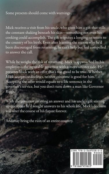 Some presents should come with warnings... Mick receives a visit from his uncle, who gives him a gift that stills the constant shaking beneath his skin-something not even his cooking could accomplish. The gift reignites a longing to return to the country of his birth. Even after learning the reason why he'd been discouraged from going, he can`t help but feel compelled to answer the call. While he weighs the risk of returning, Mick is approached by his employer-the reputable governor with a more sinister side. He presents Mick with an offer that's too good to be true. Whether Mick accepts or declines, neither outcome is good for him. Accepting the offer would equate to a life sentence in the governor's service, but you don't turn down a man like Governor Riggs. With the governor awaiting an answer and his uncle's gift stirring up old questions he'd sought answers to his whole life, Mick's decision will alter the course of his future forever. And may bring the ruin of an entire country...