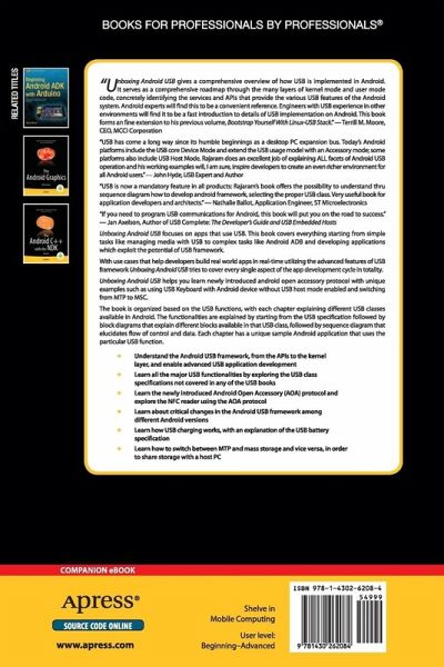 With use cases that help developers build real world apps in real-time utilizing the advanced features of USB framework Unboxing Android USB tries to cover every single aspect of the app development cycle in totality.