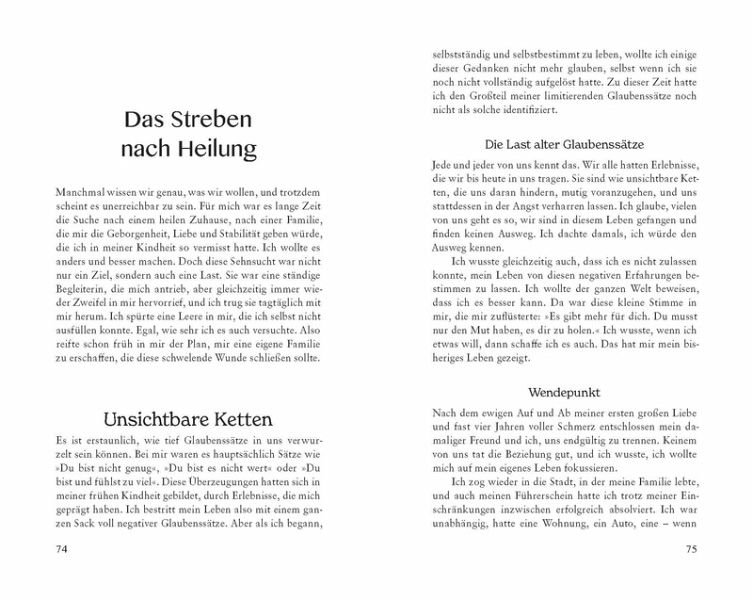 Zudem wird aufgezeigt, welche Macht Sprache in der Formung von Selbstbildern hat. Abwertende Sätze wie Das bildest du dir ein oder Stell dich nicht so an sind Teil kollektiver Erfahrung und zeigen, wie tief Verhaltensmuster greifen können. Am Beispiel ihrer eigenen Geschichte von den Prägungen der Kindheit bis hin zur späten Diagnose eines Lipödems macht die Autorin sichtbar, wie sich individuelle Entwicklung im Spannungsfeld von Fremdbestimmung und Selbstgestaltung vollzieht.