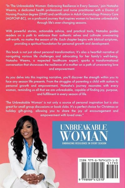 In 'The Unbreakable Woman: Embracing Resilience in Every Season,' join Natasha Weems, a dedicated health professional and nurse practitioner with a Doctor of Nursing Practice degree (DNP) and certification in Adult-Gerontology Primary Care (AGPCNP-BC), on a profound journey that inspires women to become unbreakable through life's ever-changing seasons. With powerful stories, actionable advice, and practical tools, Natasha guides readers on a path to embrace their authentic selves and cultivate unwavering self-worth, no matter the season of life. Each chapter begins with biblical scriptures, providing a spiritual foundation for personal growth and development. This book is not just about personal transformation; It's also a heartfelt narrative of navigating various life challenges and advocating for her family's well-being. Natasha Weems, a respected healthcare expert, sparks a transformational conversation that showcases the resilience of a mother on a path of unwavering love and empowerment. As you delve into this inspiring narrative, you'll discover the strength within you to face any season life presents. From the struggles of parenting a child with autism to personal growth and empowerment, Natasha's journey resonates with every woman, reminding us all that we are unbreakable, capable of finding joy, purpose, and fulfillment in every season of life. 'The Unbreakable Woman' is not only a source of personal inspiration but is also great for small group discussions or book clubs. It's a perfect choice for Christmas or holiday gift-giving, allowing you to share the joy of encouragement and empowerment with loved ones.